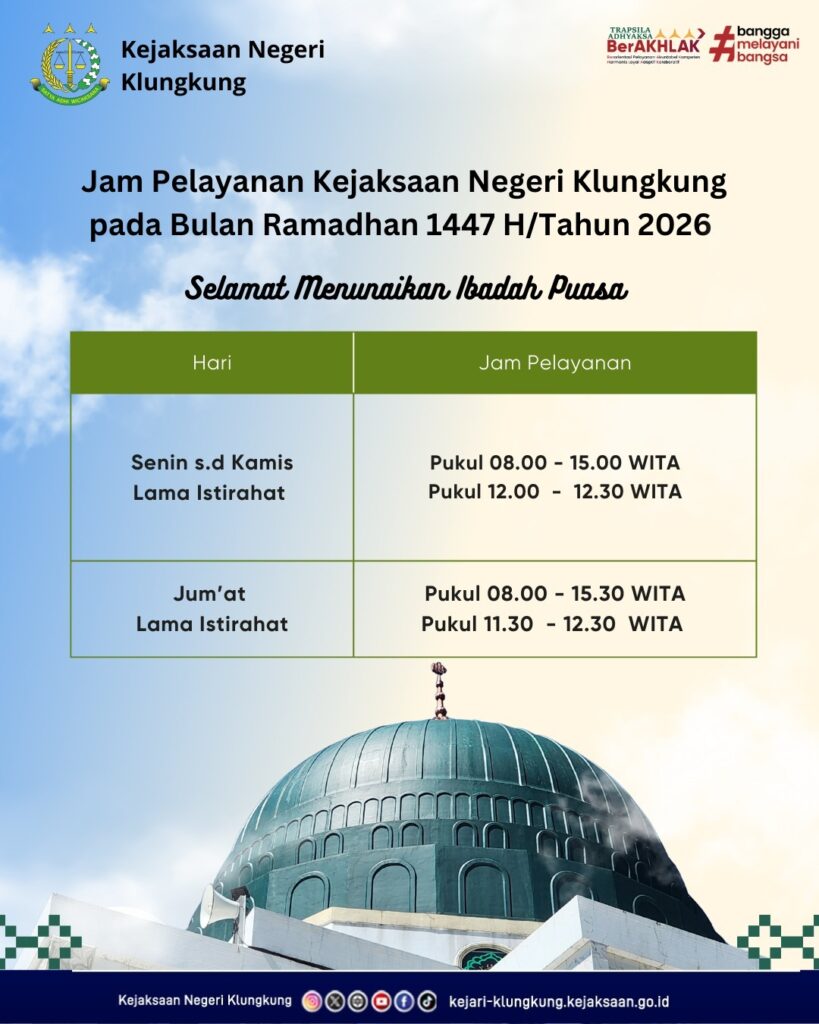 Dalam rangka menyambut dan menjalankan ibadah suci Ramadhan 1447 H, bersama ini kami sampaikan penyesuaian jam pelayanan pada Kejaksaan Negeri Klungkung sebagai berikut: