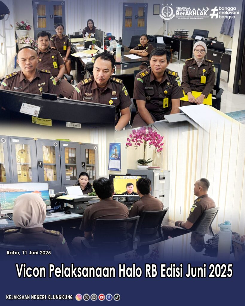 Rabu, 11 Juni 2025 bertempat di Ruangan Kerja Bidang Pembinaan Kantor Kejaksaan Negeri Klungkung, Kepala Sub Bagian Pembinaan Kejaksaan Negeri Klungkung, Julius Anthony, S.H. didampingi oleh Kepala Urusan Tata Usaha, Kepegawaian, Keuangan, dan Penerimaan Negara Bukan Pajak Kejaksaan Negeri Klungkung, I Made Ariana Usadha, A.Md., dan Kepala Urusan Perlengkapan, Data Statistik Kriminal dan Teknologi Informasi & Perpustakaan, I Wayan Winartha, S.H. beserta jajaran mengikuti Acara Pelaksanaan HaloRB (Reformasi Birokrasi) Periode Juni Tahun 2025 yang dilaksanakan secara daring. Dengan Tema “Aspek Kebijakan Pemantauan dan Evaluasi Kinerja Penyelenggaraan Pelayanan Publik (PEKPPP) serta Pelayanan Publik Inklusif Ramah Kelompok Rentan Tahun 2025.