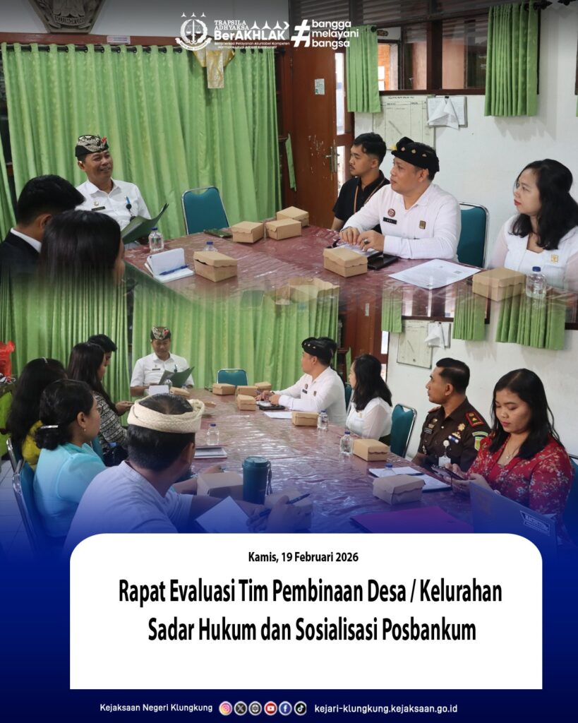 Kamis, 19 Februari 2026, telah dilaksanakan Rapat Evaluasi Tim Pembinaan Desa/Kelurahan Sadar Hukum dan Sosialisasi Pos Bantuan Hukum (Posbankum) sebagai bentuk komitmen dalam meningkatkan kesadaran hukum masyarakat di wilayah Kabupaten Klungkung.