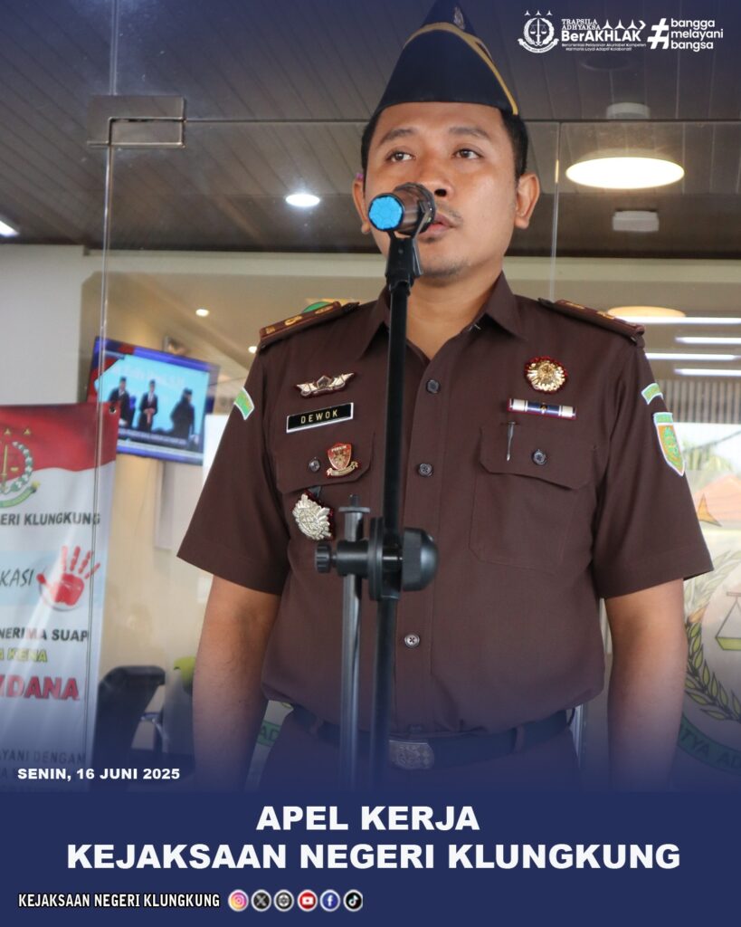 Pada Hari Senin, 16 Juni 2025, bertempat di Lobby Kantor Kejaksaan Negeri Klungkung, Jalan Gajah Mada No. 56 Semarapura, seluruh Pegawai Kejaksaan Negeri Klungkung dan PPNPN Kejaksaan Negeri Klungkung mengikuti Apel Kerja yang dipimpin oleh Kepala Seksi Tindak Pidana Umum I D. G. P. Awatara, S.H.,M.H