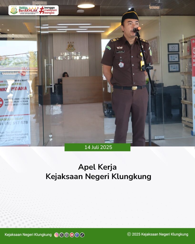 Pada Hari Senin, 14 Juli 2025, bertempat di Lobby Kantor Kejaksaan Negeri Klungkung, Jalan Gajah Mada No. 56 Semarapura, seluruh Pegawai dan PPNPN Kejaksaan Negeri Klungkung mengikuti Apel Kerja yang dipimpin oleh Kepala Sub Bagian Pembinaan Kejaksaan Negeri Klungkung, Julius Anthony, S.H.,