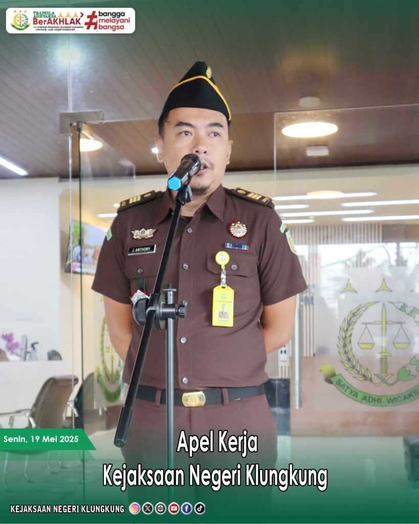 Pada Hari Senin, 19 Mei 2025, bertempat di Lobby Kantor Kejaksaan Negeri Klungkung, Jalan Gajah Mada No. 56 Semarapura, seluruh Pegawai dan PPNPN Kejaksaan Negeri Klungkung mengikuti Apel Kerja yang dipimpin oleh Kepala Sub Bagian Pembinaan Kejaksaan Negeri Klungkung, Julius Anthony, S.H.