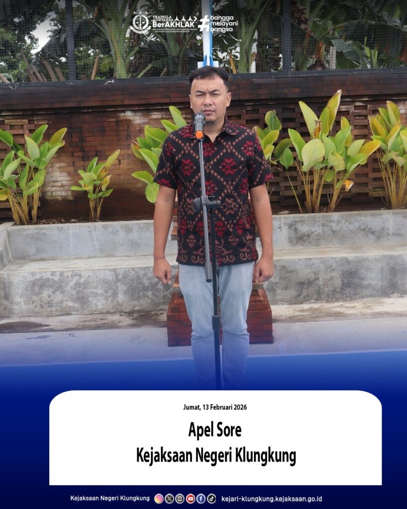 Jumat, 13 Februari 2026 bertempat di Lapangan Kejaksaan Negeri Klungkung seluruh Pegawai dan PPNPN Kejaksaan Negeri Klungkung telah melaksanakan Apel Sore yang diterima oleh Kepala Sub Bagian Pembinaan Kejaksaan Negeri Klungkung, Julius Anthony, S.H.