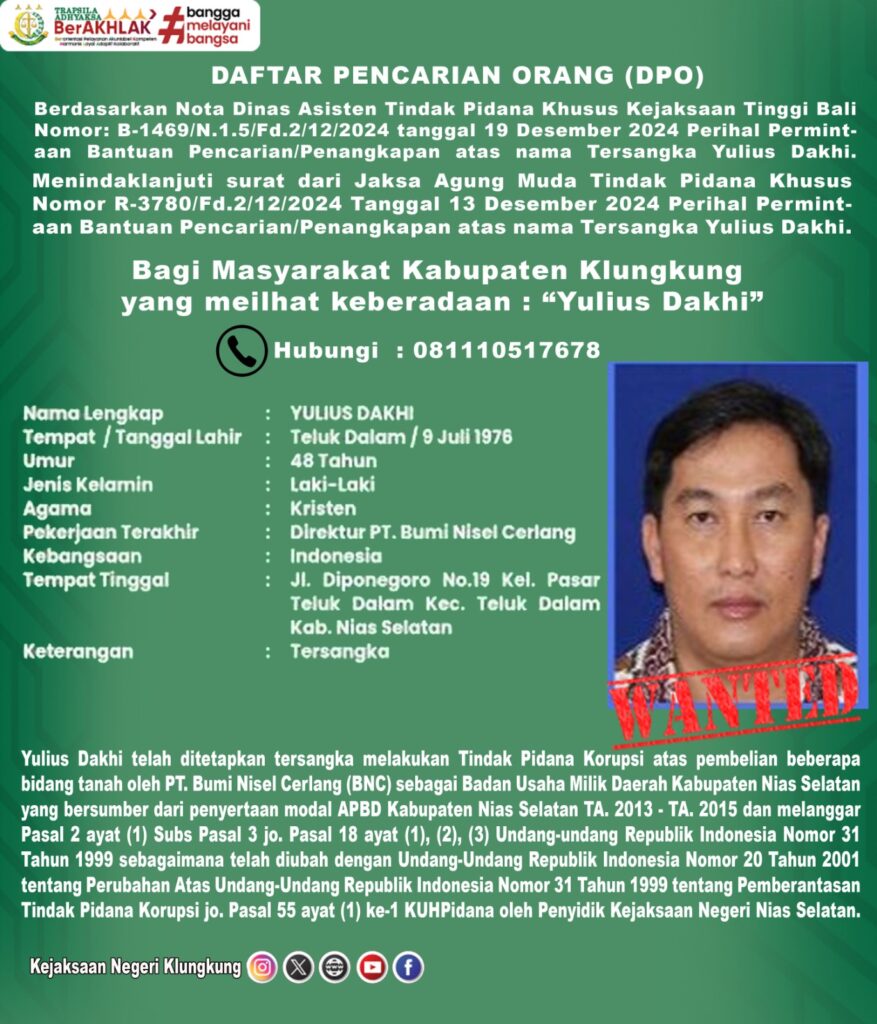 Berdasarkan Nota Dinas Asisten Tindak Pidana Khusus Kejaksaan Tinggi Bali Nomor: B-1469/N.1.5/Fd.2/12/2024 tanggal 19 Desember 2024 Perihal Permintaan Bantuan Pencarian/Penangkapan […]