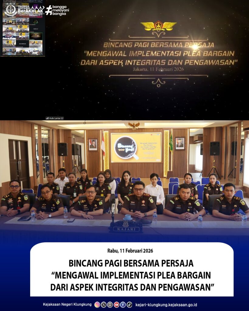 Kepala Kejaksaan Negeri Klungkung, R. Indra Senjaya, S.H., M.H., didampingi oleh Para Kepala Seksi dan para Jaksa pada Kejaksaan Negeri Klungkung mengikuti kegiatan Bincang Pagi Bersama PERSAJA dengan tema “Mengawal Implementasi Plea Bargain dari Aspek Integritas dan Pengawasan” pada Rabu, 11 Februari 2026.