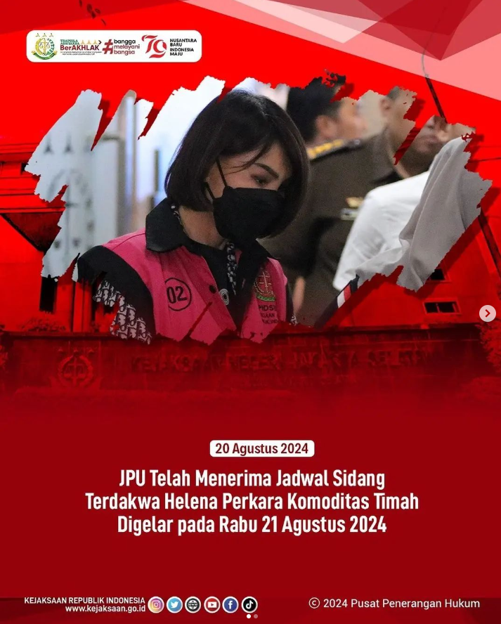 Jadwal Penetapan Sidang Terhadap Terdakwa Helena dalam perkara dugaan Tindak Pidana Korupsi dalam Pengelolaan Tata Niaga Komoditas Timah di Wilayah Izin Usaha Pertambangan (IUP) di PT Timah Tbk tahun 2015 s/d 2022