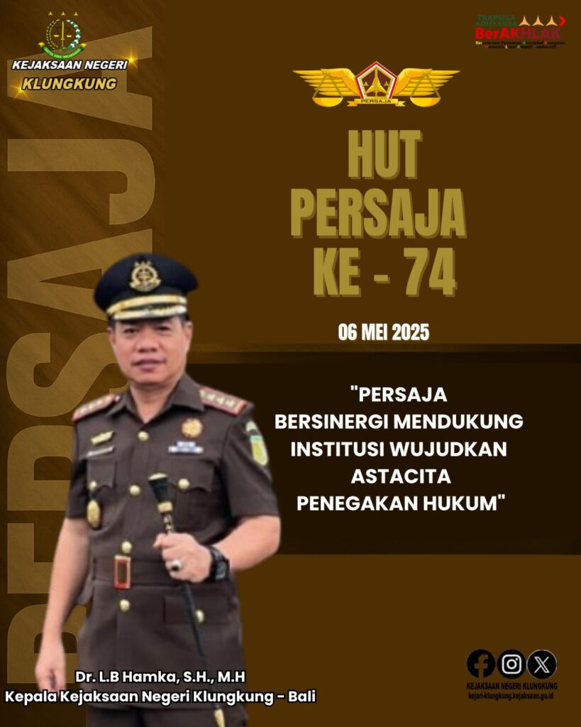 Kepala Kejaksaan Negeri Klungkung, Dr. L.B Hamka, S.H., M.H., beserta jajaran mengucapkan: Selamat Hari Ulang Tahun ke-74 PERSAJA 6 Mei