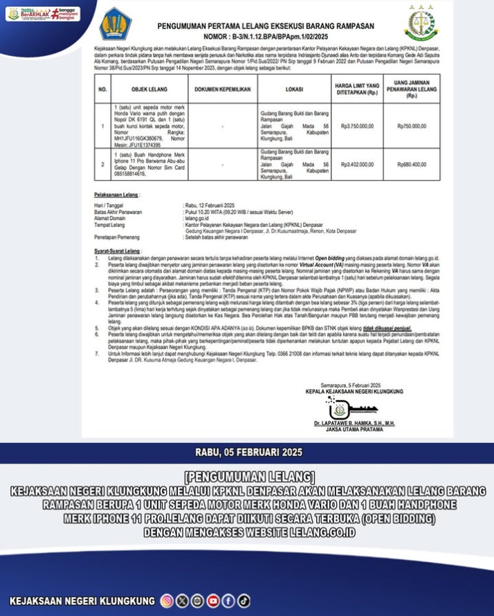 Kejaksaan Negeri Klungkung melalui KPKNL Denpasar akan melaksanakan lelang Barang Rampasan berupa 1 unit sepeda motor merk Honda Vario dan […]