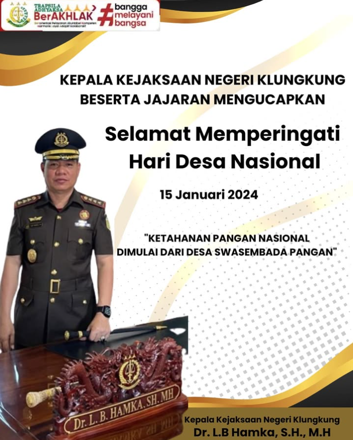 Kepala Kejaksaan Negeri Klungkung Dr. L.B Hamka, S.H., M.H beserta jajaran mengucapkan :Selamat atas Terpilihnya, Prof. Dr. Asep N. Mulyana,