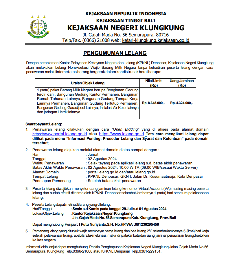 Sahabat Adhyaksa, Kejaksaan Negeri Klungkung akan melaksanakan Lelang Non Eksekusi Wajib Barang Milik Negara tanpa kehadiran peserta lelang dengan cara