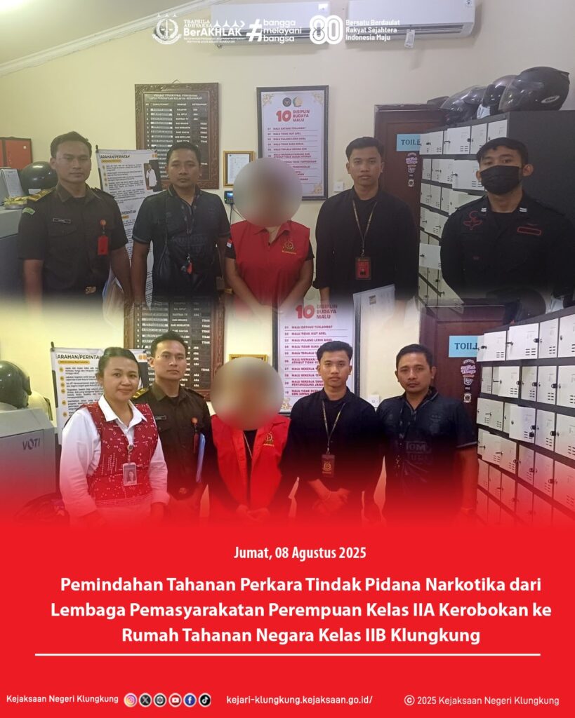 Pada hari Jumat, 08 Agustus 2025 Team Jaksa Eksekusi bersama Satuan Pengawal Pidum Kejaksaan Negeri Klungkung telah melaksanakan Eksekusi terhadap Terpidana dalam perkara tindak pidana Perlindungan Anak ke Lembaga Pemasyarakatan Perempuan Kelas IIA Kerobokan serta melaksanakan Penetapan Pengadilan Negeri Semarapura untuk melakukan pemindahan tahanan perkara tindak pidana narkotika dari Lembaga Pemasyarakatan Perempuan Kelas IIA Kerobokan ke Rumah Tahanan Negara Kelas IIB Klungkung guna mempermudah proses persidangan.