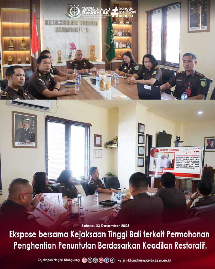 Pada hari Selasa tanggal 23 Desember 2025 bertempat di Ruang Kepala Kejaksaan Negeri Klungkung, Kepala Kejaksaan Negeri Klungkung, I Wayan Suardi, S.H.,M.H. bersama Kasi Pidum Kejaksaan Negeri Klungkung I D.G.P.Awatara, S.H.,M.H didampingin Kadek Ayu Kartika Dewi sebagai Jaksa Fasilitator dan Jaksa pada bidang Pidana Umum melaksanakan kegiatan Ekspose bersama Kejaksaan Tinggi Bali terkait Permohonan Penghentian Penuntutan Berdasarkan Keadilan Restoratif.