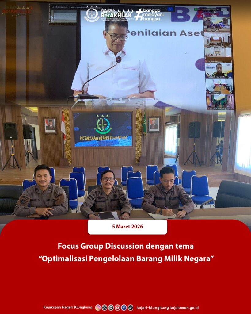 Kepala Seksi Pemulihan Aset dan Pengelolaan Barang Bukti serta Barang Rampasan, Mustabihul Amri, S.H., didampingi staf pada Seksi Pemulihan Aset dan Pengelolaan Barang Bukti serta Barang Rampasan Kejaksaan Negeri Klungkung mengikuti Focus Group Discussion (FGD) dengan tema “Optimalisasi Pengelolaan Barang Milik Negara” pada Rabu, 5 Maret 2026.