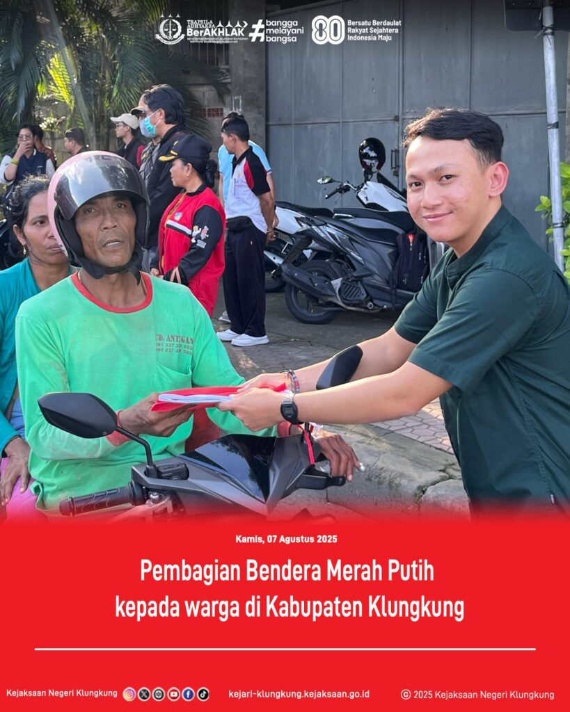 Kejaksaan Negeri Klungkung bersama Forkopimda Kabupaten Klungkung membagikan bendera Merah Putih kepada masyarakat yang melintas di wilayah Kabupaten Klungkung. 07/08/2025