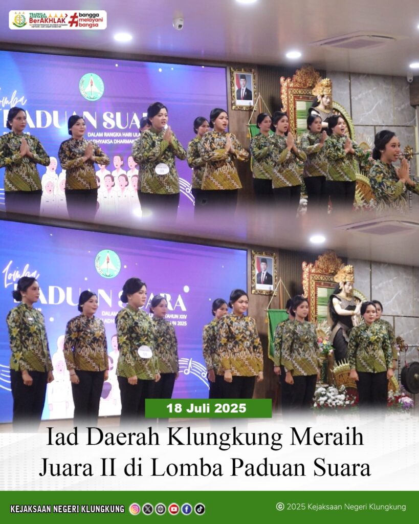 IAD Daerah Klungkung sukses meraih Juara II pada ajang Lomba Paduan Suara yang berlangsung di Auditorium ST. Burhanuddin, pada 18 Juli 2025.