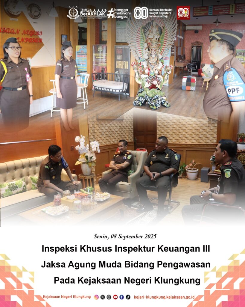 Senin, 08 September 2025, Kepala Kejaksaan Negeri Klungkung I Wayan Suardi, S.H., M.H. bersama para Kepala Seksi dan pegawai menerima Inspeksi Khusus dari Inspektur Keuangan III JAM Was di Kantor Kejari Denpasar.