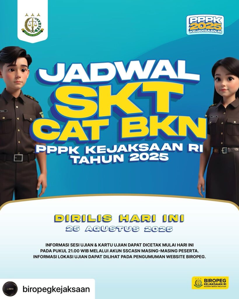 Posted @withregram • @biropegkejaksaan Jadwal Seleksi Kompetensi Teknis dengan CAT BKN PPPK Kejaksaan RI telah diumumkan. Lokasi ujian dapat dicek melalui pengumuman di website Biropeg.
