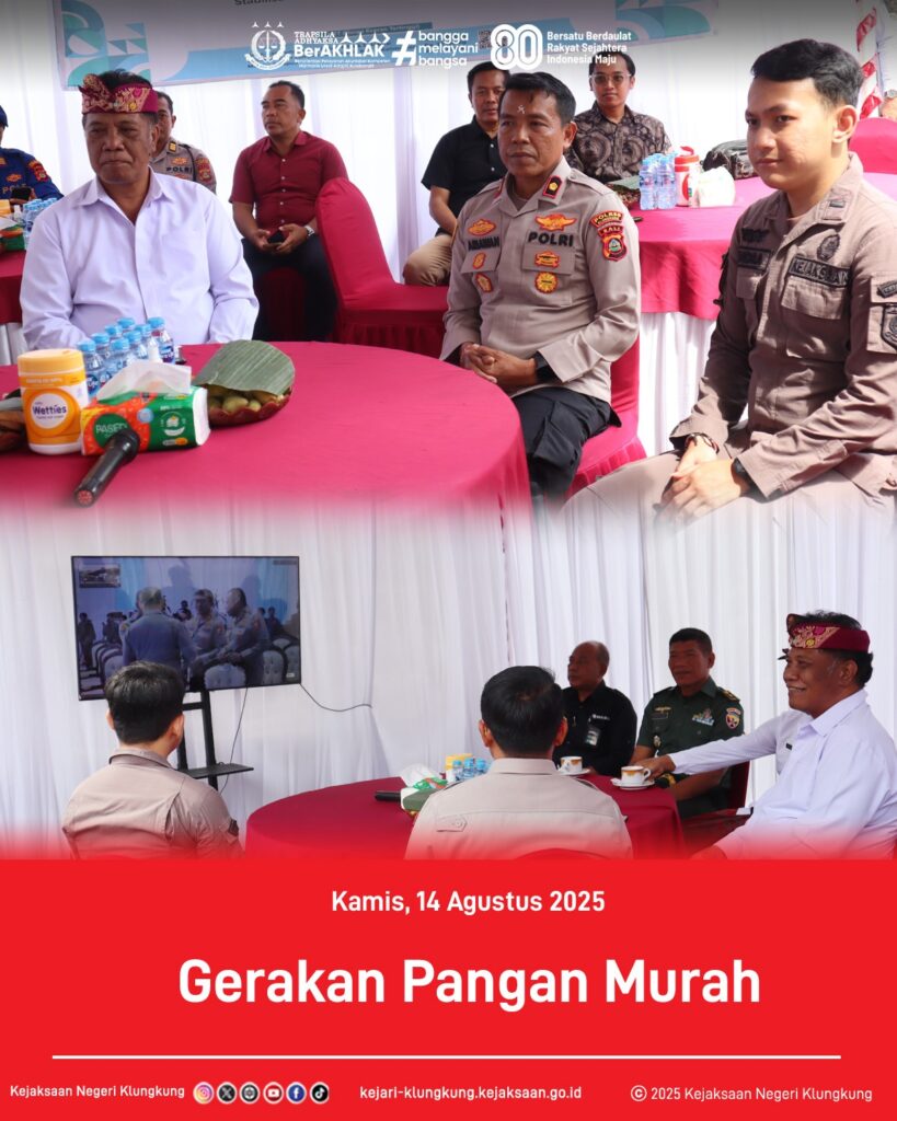 Kepala Kejaksaan Negeri Klungkung yang di wakili oleh Rendra Abdila Sadewa, S.H., Jaksa pada Bidang Intelijen menghadiri kegiatan Gerakan Pangan Murah bersama Forkopimda Kabupaten Klungkung yang diselenggarakan oleh Polres Klungkung pada Kamis (14/8/2025).