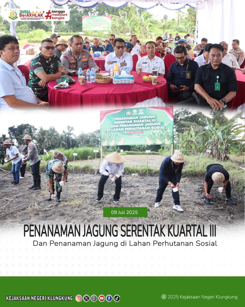 Pada Selasa, 09 Juli 2025, Kepala Kejaksaan Negeri Klungkung Dr. L.B Hamka, S.H., M.H yang diwakili oleh Kepala Seksi Intelijen, Ngurah Gede Bagus Jatikusuma, S.H., menghadiri kegiatan Penanaman Jagung Serentak Kuartal III dan Penanaman Jagung di Lahan Perhutanan Sosial.