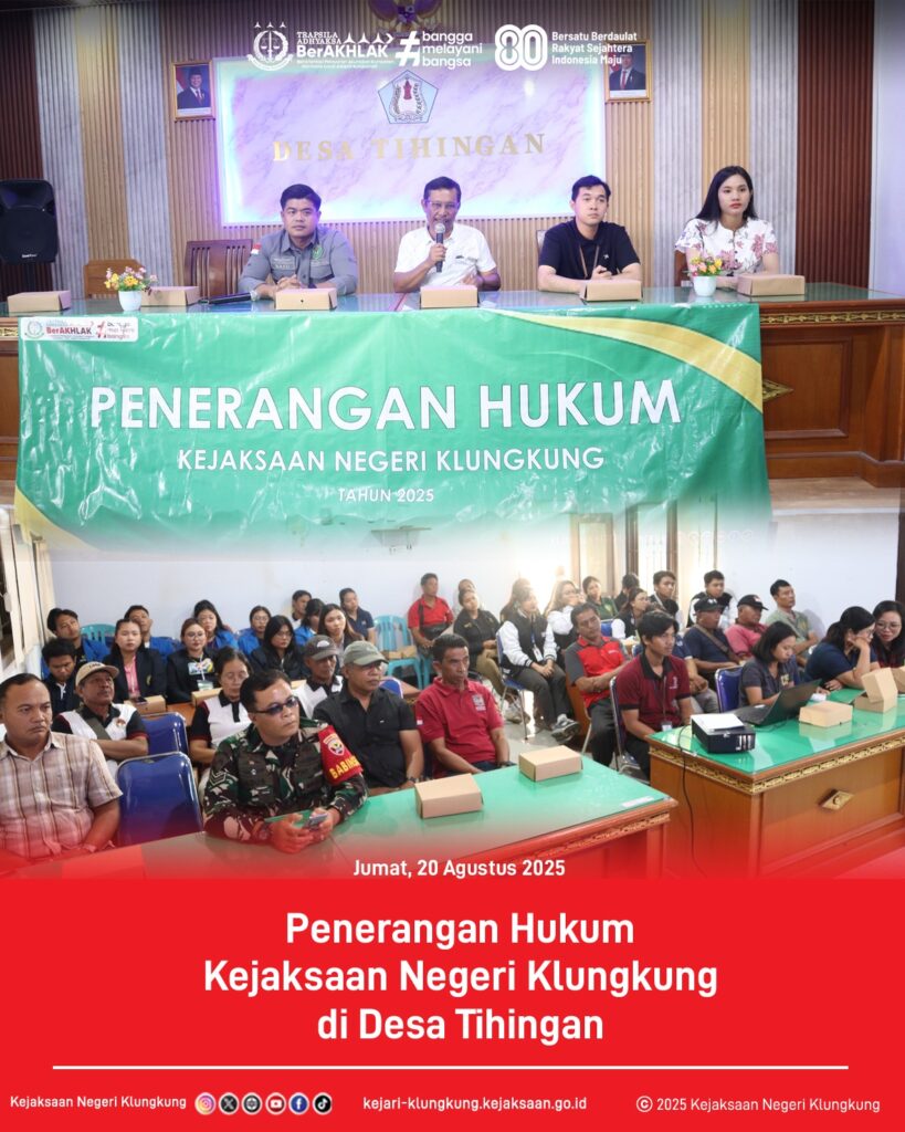 Bahwa pada hari Jumat, 22 Agustus 2025 bertempat di Desa Tihingan, Kecamatan Banjarangkan, Kabupaten Klungkung telah dilaksanakan kegiatan Penerangan Hukum dengan tema “Keuangan Desa (Potensi Tipikor dan Pencegahannya)” oleh Kasubsi I Intelijen I Gusti Ngurah Bayu Satriawan, S.H., Kasubsi II Intelijen Chicko Surya Siswanto, S.H., dan Jaksa Fungsional Fricha Elsafara, S.H., M.Kn.,