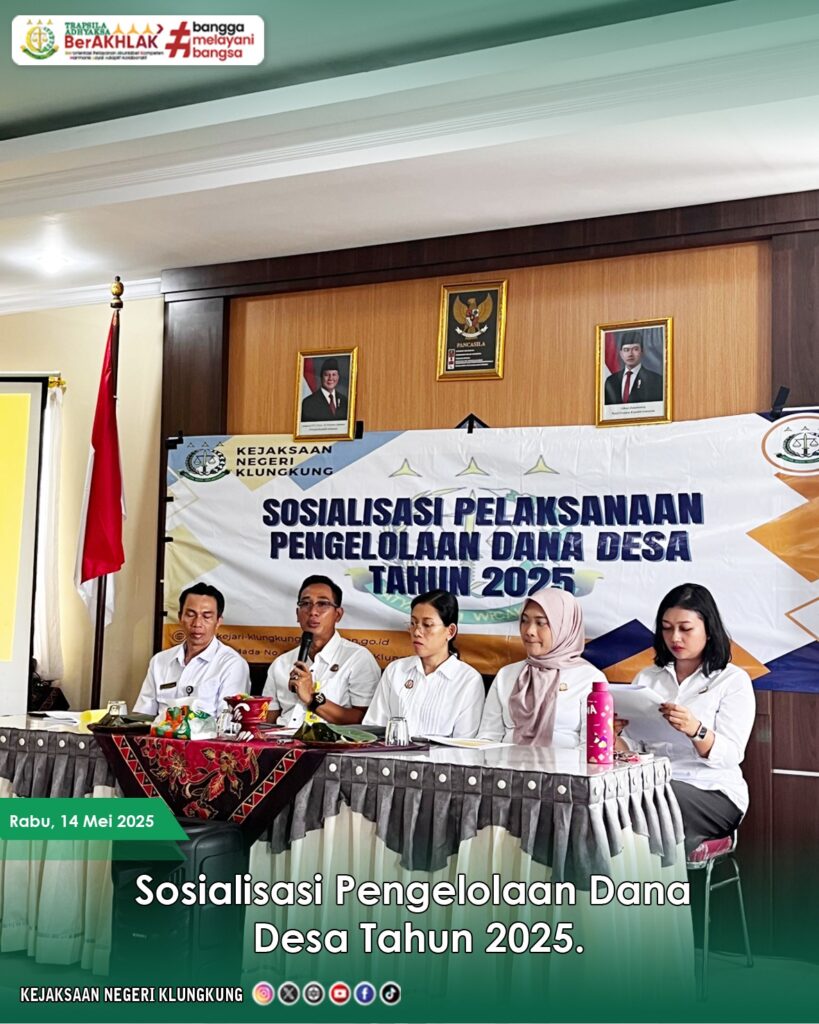 Pada hari Rabu, 14 Mei 2025 Bertempat di Ruang Pertemuan Kantor Perbekel Desa Satra, Kepala Seksi Perdata dan Tata Usaha Negara I Dewa Nyoman Wira Adiputra, SH., MH., dan Tim Jaksa Pengacara Negara (JPN) Kejaksaan Negeri Klungkung telah melaksanakan kegiatan Sosialisasi Pengelolaan Dana Desa Tahun 2025.