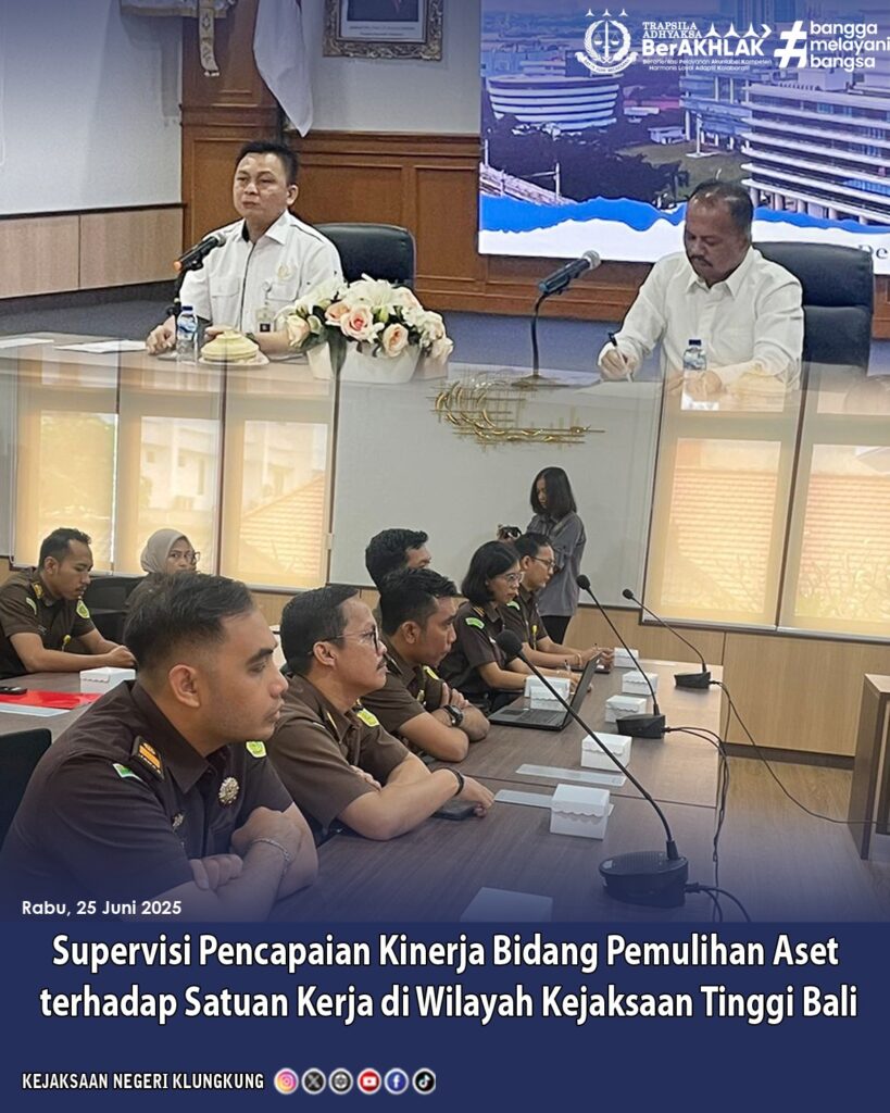 Pada hari Rabu tanggal 25 Juni 2025 pukul 09.30 wita, kepala seksi Pemulihan Aset dan Pengelolaan Barang Bukti Kejari Klungkung MUSTABIHUL AMRI, SH, mengikuti kegiatan Supervisi pencapaian kinerja bidang pemulihan aset terhadap satuan kerja di wilayah kejaksaan tinggi Bali di aula sasana darma kejaksaan tinggi Bali. Kegiatan tersebut bertujuan untuk memaksimalkan kinerja bidang pemulihan aset dan pengelolaan barang bukti.