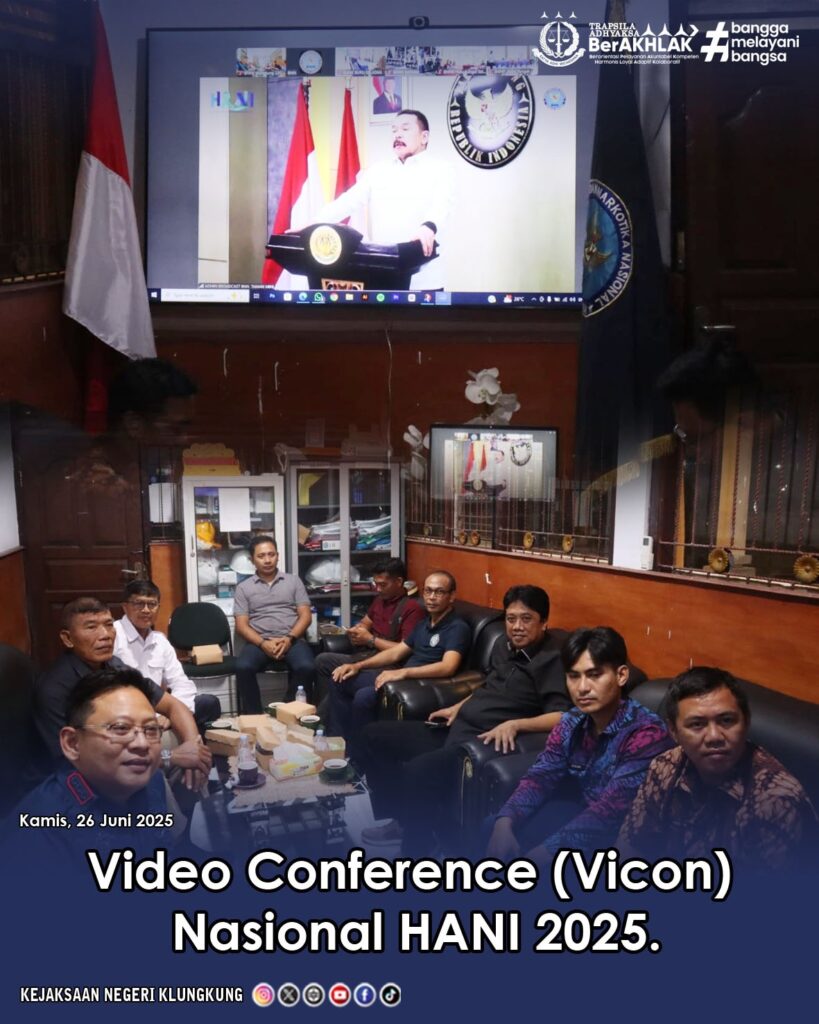 Kamis, 26 Juni 2025, Bertempat di Kantor BNN Kabupaten Klungkung di Mulai Pukul 20.00 WITA, Dalam rangka memperingati Hari Anti Narkotika Internasional (HANI) 2025 Kepala Kejaksaan Negeri Klungkung, Dr. L.B. Hamka, S.H., M.H., yang diwakili oleh Kepala Seksi Tindak Pidana Umum Kejaksaan Negeri Klungkung I D.G.P. Awatara, S.H., M.H., bersama Kepala BNNK Klungkung serta jajaran Forkopimda Kabupaten Klungkung, mengikuti Video Conference (Vicon) nasional HANI 2025.