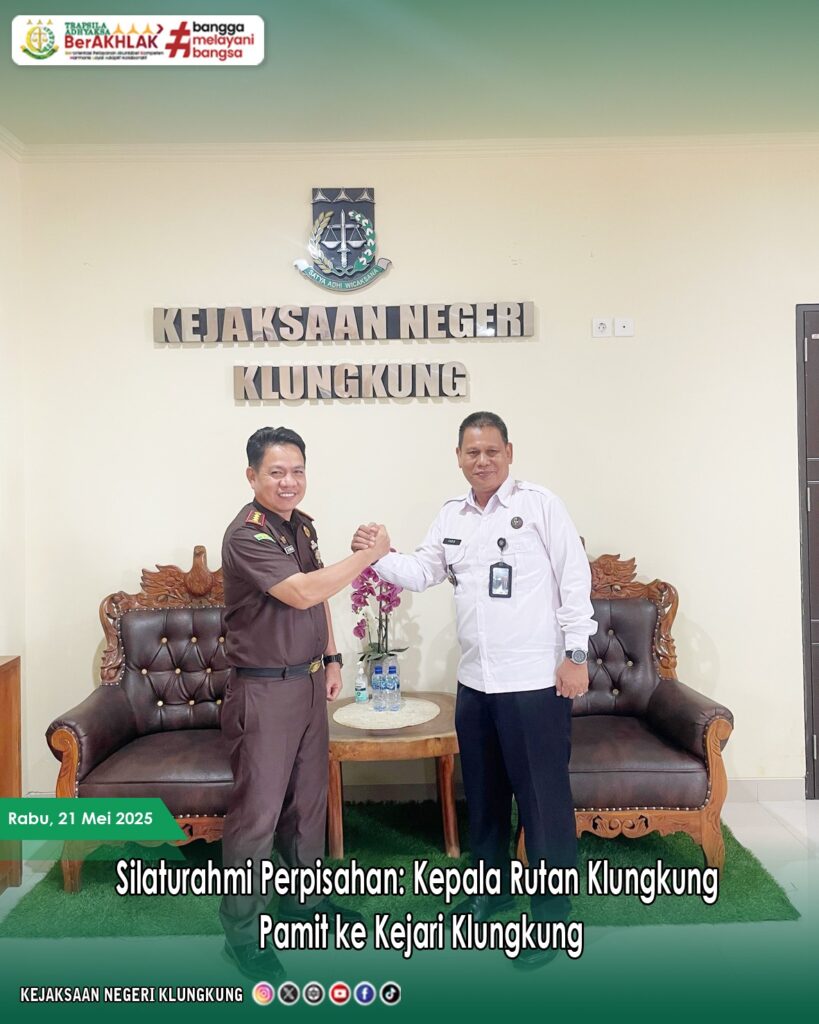 Rabu, 21 Mei 2025 Bertempat di Kantor Kejaksaan Negeri Klungkung, Kepala Kejaksaan Negeri Klungkung, Dr. L.B Hamka, S.H., M.H., menerima kunjungan silaturahmi perpisahan dari Kepala Rutan Kelas IIB Klungkung, yang akan melanjutkan tugas di tempat baru.