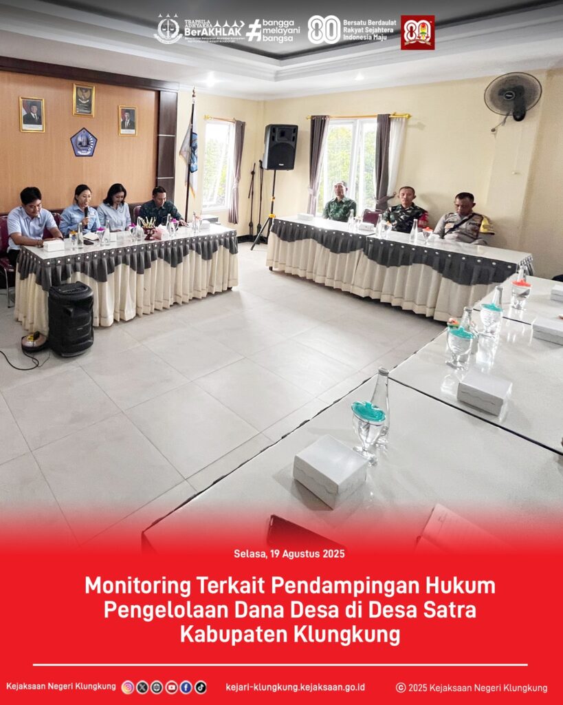 Pada hari Selasa, 19 Agustus 2025, Tim Jaksa Pengacara Negara (JPN) Kejaksaan Negeri Klungkung melaksanakan kegiatan Monitoring terkait Pendampingan Hukum Pengelolaan Dana Desa di Desa Satra, Kabupaten Klungkung.