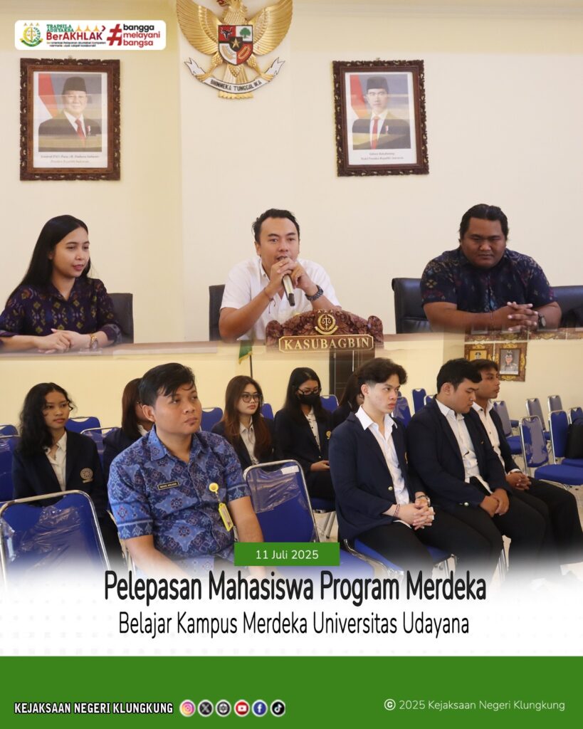 Jumat, 11 Juli 2025 Bertempat di Aula Kejaksaan Negeri Klungkung, Kejaksaan Negeri Klungkung melaksanakan kegiatan pelepasan mahasiswa peserta Program Merdeka Belajar Kampus Merdeka (MBKM) Universitas Udayana yang telah menyelesaikan masa praktiknya.