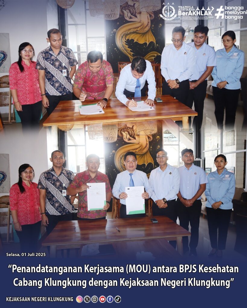 Selasa, 01 Juli 2025, Dr. Lapatawe B. Hamka, S.H., M.H. selaku Kepala Kejaksaan Negeri Klungkung yang didampingi oleh I Dewa Nyoman Wira Adiputra, S.H., M.H. Selaku Kepala Seksi Perdata dan Tata Usaha Negara Beserta Jaksa Pengacara Negara (JPN) melaksanakan “Penandatanganan Kerjasama (MOU) antara BPJS Kesehatan Cabang Klungkung dengan Kejaksaan Negeri Klungkung” bertempat di Warung Bendega, Lebih.