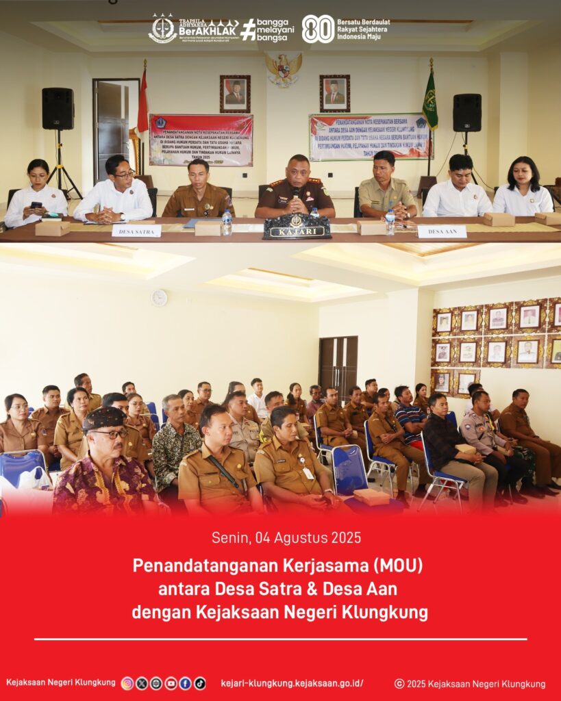 Penandatanganan Kerjasama (MoU) antara Desa Satra & Desa Aan dengan Kejaksaan Negeri Klungkung Pada Senin, 4 Agustus 2025 di Aula Kejaksaan Negeri Klungkung. Kegiatan ini dipimpin langsung oleh Kajari Klungkung, Bapak I Wayan Suardi, S.H., M.H., didampingi Kasi Datun I Dewa Nyoman Wira Adiputra, S.H., M.H., beserta Jaksa Pengacara Negara (JPN).