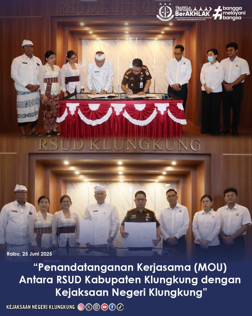 Rabu, 25 Juni 2025, Dr. Lapatawe B. Hamka, S.H., M.H. selaku Kepala Kejaksaan Negeri Klungkung yang didampingi oleh I Dewa Nyoman Wira Adiputra, S.H., M.H. selaku Kepala Seksi Perdata dan Tata Usaha Negara beserta Jaksa Pengacara Negara (JPN) melaksanakan “Penandatanganan Kerjasama (MOU) Antara RSUD Kabupaten Klungkung dengan Kejaksaan Negeri Klungkung” bertempat di Aula RSUD Kabupaten Klungkung.
