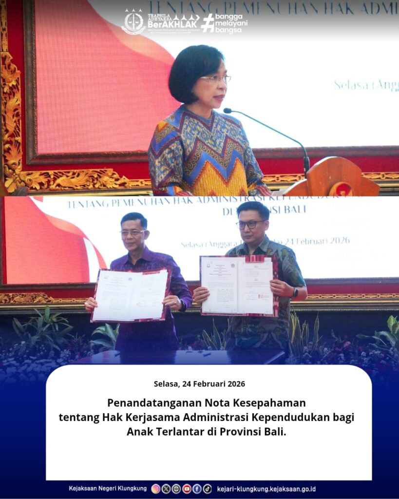 Kepala Kejaksaan Negeri Klungkung, R. Indra Senjaya, S.H., M.H., Bersama Bupati Klungkung melaksanakan penandatanganan Nota Kesepahaman sebagai bentuk komitmen nyata dalam mendukung pemenuhan hak administrasi kependudukan bagi anak terlantar di wilayah Provinsi Bali, Khususnya di Kabupaten Klungkung
