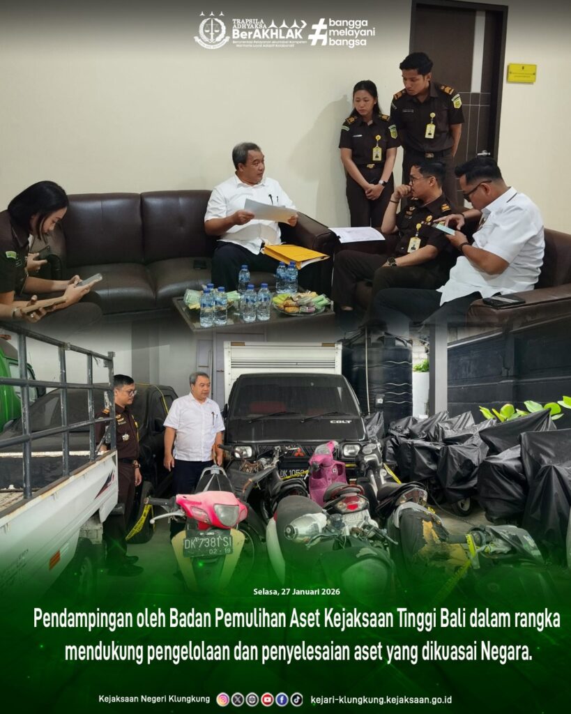 Selasa, 27 Januari 2026 bertempat di Ruang Seksi Pemulihan Aset dan Pengelolaan Barang Bukti Kejaksaan Negeri Klungkung telah dilaksanakan kegiatan pendampingan oleh Badan Pemulihan Aset Kejaksaan Tinggi Bali dalam rangka mendukung pengelolaan dan penyelesaian aset yang dikuasai negara.