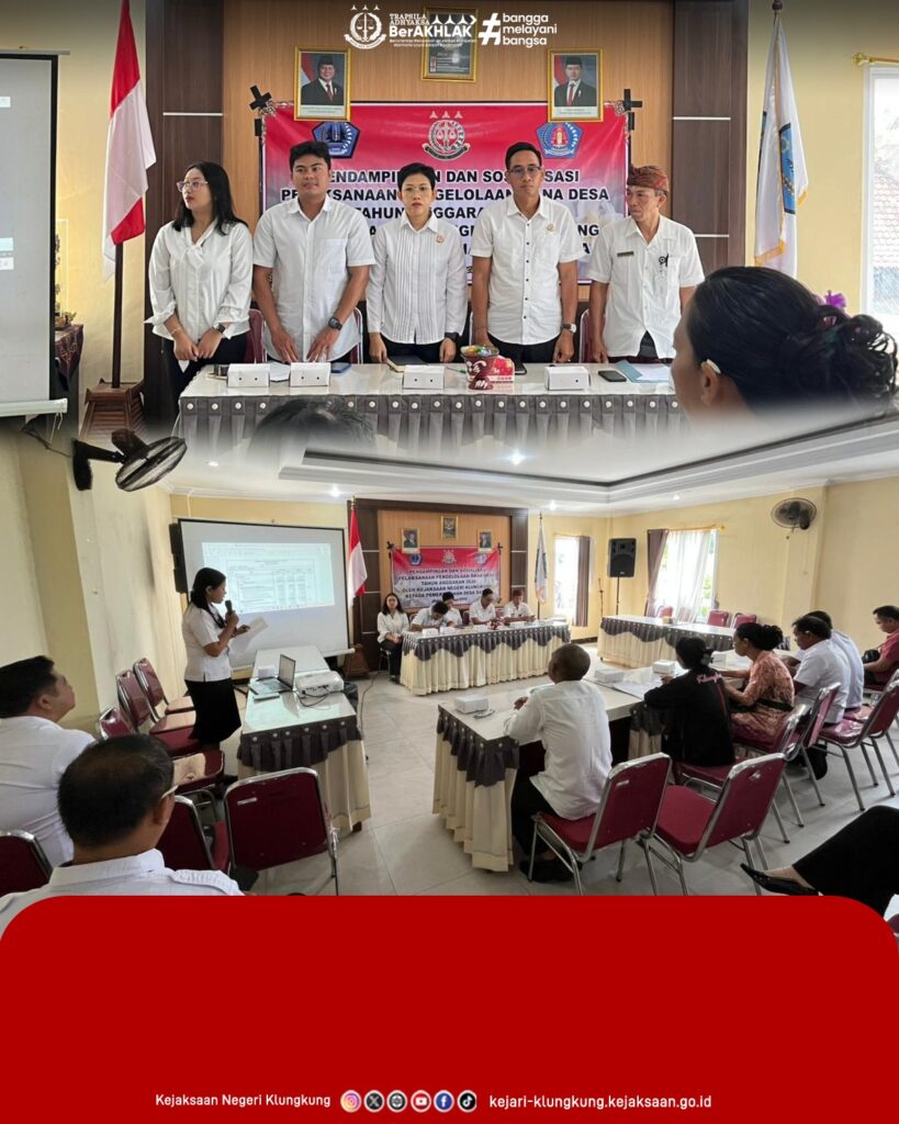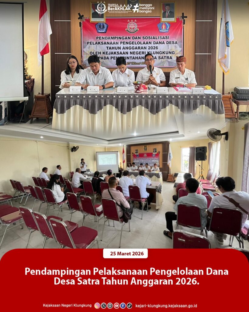 Pada hari Rabu, 25 Maret 2026 bertempat di Kantor Desa Satra Kabupaten Klungkung, Kejaksaan Negeri Klungkung melalui Bidang Perdata dan TUN melaksanakan Pendampingan Pelaksanaan Pengelolaan Dana Desa Satra Tahun Anggaran 2026.