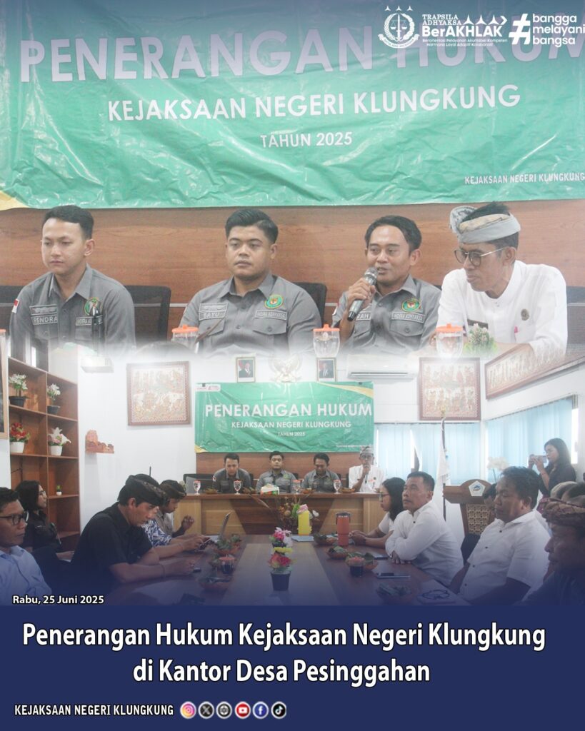 Rabu, 25 Juni 2025, Bertempat di Ruang Rapat Kantor Desa Pesinggahan, Kejaksaan Negeri Klungkung melalui Seksi Intelijen menggelar kegiatan Penerangan Hukum kepada perangkat dan masyarakat desa setempat.