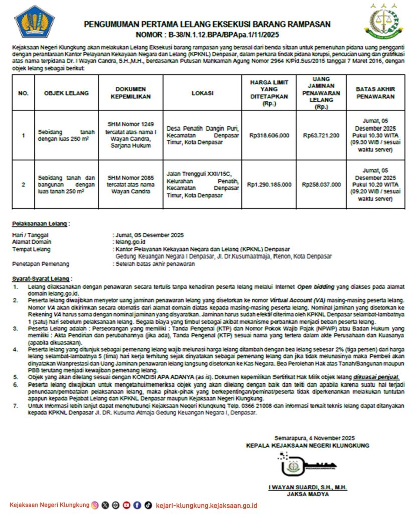 Dalam rangka pelaksanaan lelang barang sita eksekusi berupa satu bidang tanah beserta bangunan dan satu bidang tanah, dengan ini diumumkan bahwa akan dilaksanakan lelang terbuka melalui Kantor Pelayanan Kekayaan Negara dan Lelang (KPKNL) Denpasar.