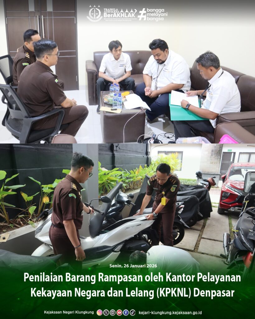 Senin 26 Januari 2026 bertempat di Ruang Seksi Pemulihan Aset dan Pengelolaan Barang Bukti Kejaksaan Negeri Klungkung telah dilaksanakan penilaian barang rampasan oleh Kantor Pelayanan Kekayaan Negara dan Lelang (KPKNL) Denpasar dalam rangka memperoleh nilai wajar atas aset yang dikuasai negara. Proses penilaian dilaksanakan secara objektif dan hasil penilaian ini menjadi dasar dalam pengelolaan, pemanfaatan, serta penyelesaian lebih lanjut terhadap barang rampasan, guna mendukung pengelolaan kekayaan negara yang transparan, akuntabel, dan tertib administrasi.