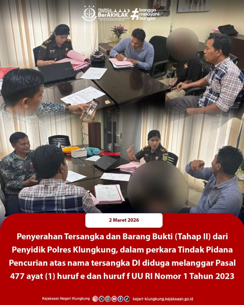 Pada hari Senin tanggal 2 Maret 2026 sekira pukul 12.00 Wita bertempat di Ruang Tahap II Kantor Kejaksaan Negeri Klungkung, Jaksa Penuntut Umum Kejaksaan Negeri Klungkung Putu Dian Kusuma Wardani, S.H. didampingi Petugas Pemulihan Aset dan Pengelolaan Barang Bukti telah menerima Penyerahan Tersangka dan Barang Bukti (Tahap II) dari Penyidik Polres Klungkung, dalam perkara Tindak Pidana Pencurian atas nama tersangka DI diduga melanggar Pasal 477 ayat (1) huruf e dan huruf f UU RI Nomor 1 Tahun 2023 tentang KUHP.