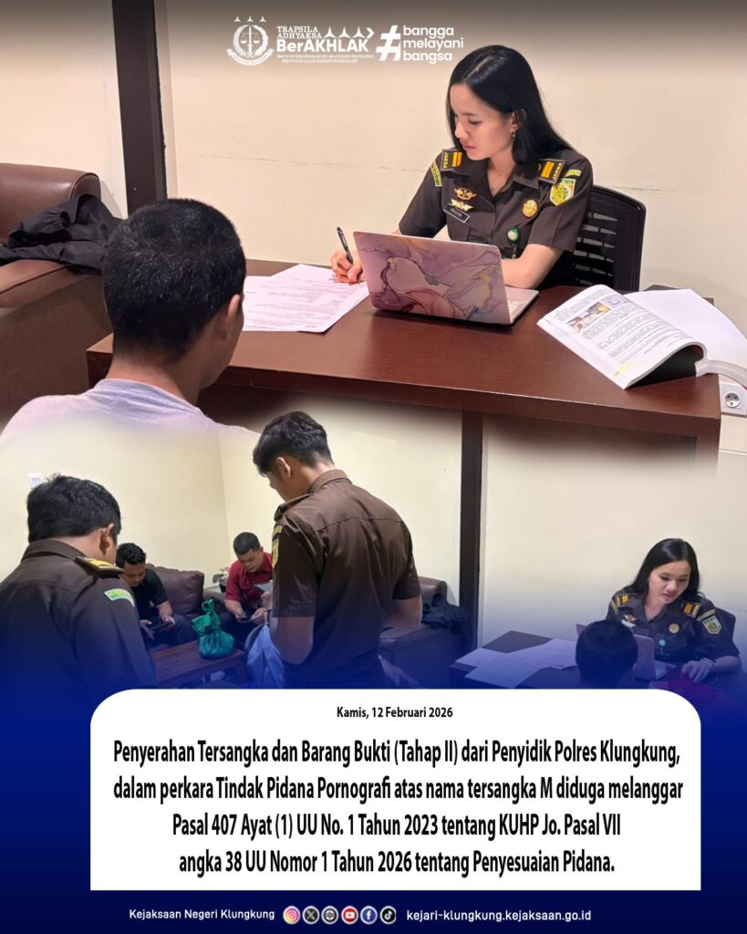 Pada hari Kamis tanggal 12 Februari 2026 sekira pukul 10.00 Wita bertempat di Ruang Tahap II Kantor Kejaksaan Negeri Klungkung, Jaksa Penuntut Umum Kejaksaan Negeri Klungkung Frischa Elsafara, S.H.,M.Kn didampingi Petugas Pemulihan Aset dan Pengelolaan Barang Bukti telah menerima Penyerahan Tersangka dan Barang Bukti (Tahap II) dari Penyidik Polres Klungkung, dalam perkara Tindak Pidana Pornografi atas nama tersangka M diduga melanggar Pasal 407 Ayat (1) UU No. 1 Tahun 2023 tentang KUHP Jo. Pasal VII angka 38 UU Nomor 1 Tahun 2026 tentang Penyesuaian Pidana.