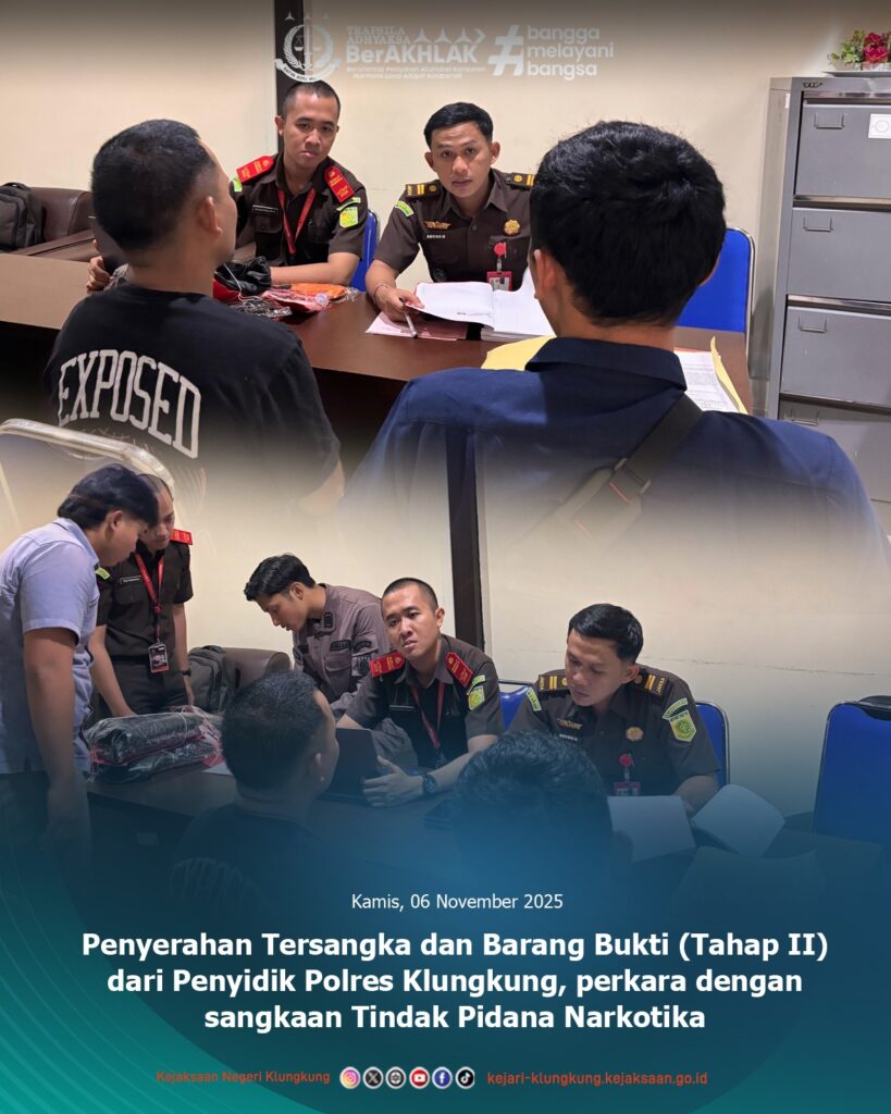 Pada hari Kamis tanggal 06 November 2025 sekira pukul 13.00 Wita bertempat di Ruang Tahap II Kantor Kejaksaan Negeri Klungkung, Jaksa Penuntut Umum Kejaksaan Negeri Klungkung I Gusti Agung Manu Kepakisan, S.H.,M.H. dan didampingi Petugas Pemulihan Aset dan Pengelolaan Barang Bukti, Pande Made Agus Prawira Dirgayusa, A.Md telah menerima Penyerahan Tersangka dan Barang Bukti (Tahap II) dari Penyidik Polres Klungkung, perkara dengan sangkaan Tindak Pidana Narkotika.