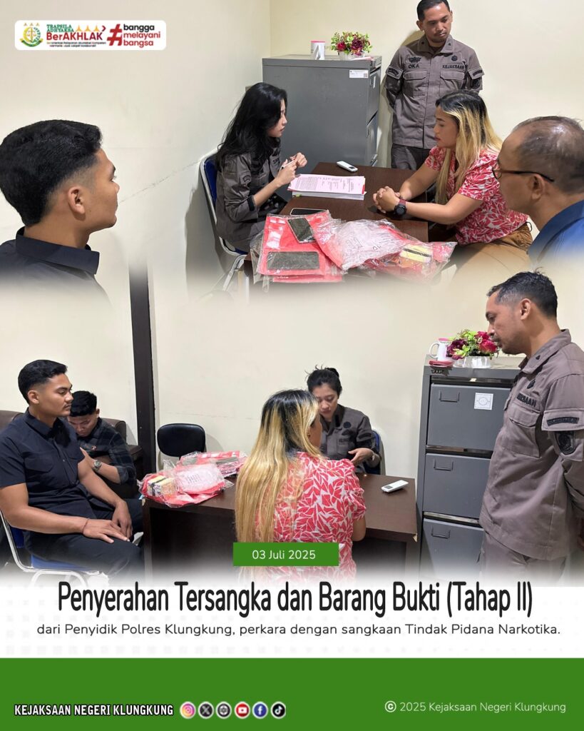 Pada hari Kamis tanggal 03 Juli 2025 sekira pukul 13.00 Wita bertempat di Ruang Tahap II Kantor Kejaksaan Negeri Klungkung, Jaksa Penuntut Umum Kejaksaan Negeri Klungkung Gandes Ristiyana, S.H. didampingi Petugas Pemulihan Aset dan Pengelolaan Barang Bukti telah menerima Penyerahan Tersangka dan Barang Bukti (Tahap II) dari Penyidik Polres Klungkung, perkara dengan sangkaan Tindak Pidana Narkotika.