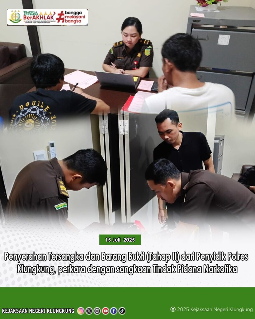 Pada hari Selasa tanggal 15 Juli 2025 sekira pukul 10.00 Wita bertempat di Ruang Tahap II Kantor Kejaksaan Negeri Klungkung, Jaksa Penuntut Umum Kejaksaan Negeri Klungkung Indira Trisdanadea, S.H. didampingi Petugas Pemulihan Aset dan Pengelolaan Barang Bukti telah menerima Penyerahan Tersangka dan Barang Bukti (Tahap II) dari Penyidik Polres Klungkung, perkara dengan sangkaan Tindak Pidana Narkotika