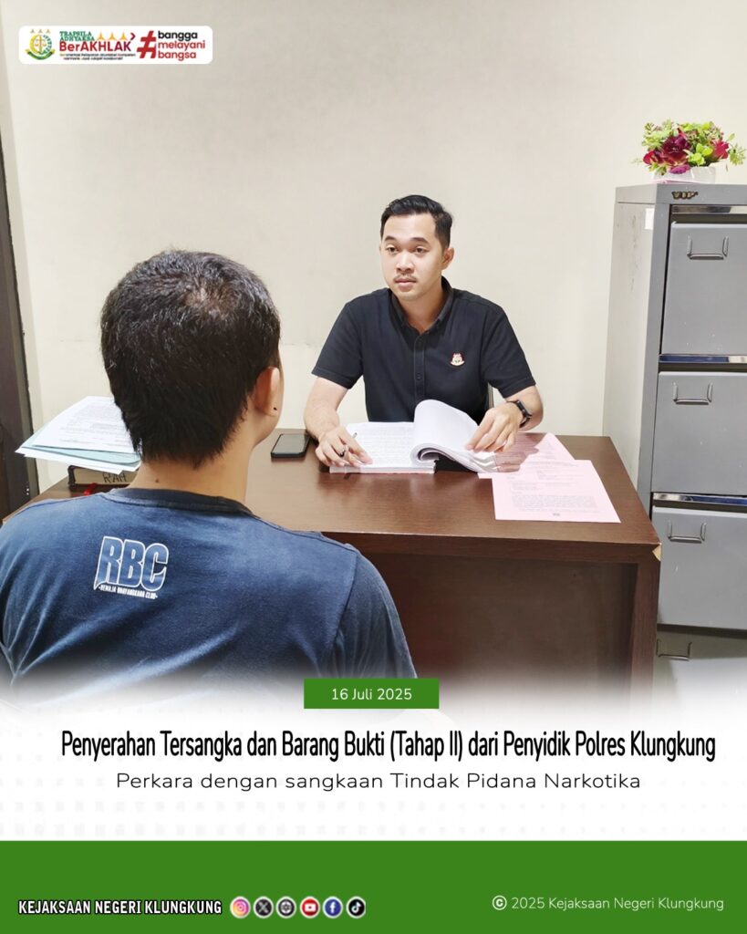 Pada hari Rabu tanggal 16 Juli 2025 sekira pukul 10.00 Wita bertempat di Ruang Tahap II Kantor Kejaksaan Negeri Klungkung, Jaksa Penuntut Umum Kejaksaan Negeri Klungkung Chicko Surya Siswanto, S.H. didampingi Petugas Pemulihan Aset dan Pengelolaan Barang Bukti telah menerima Penyerahan Tersangka dan Barang Bukti (Tahap II) dari Penyidik Polres Klungkung, perkara dengan sangkaan Tindak Pidana Narkotika