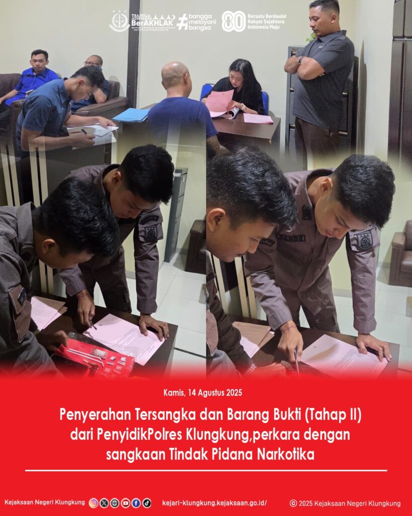 Pada hari Kamis tanggal 14 Agustus 2025 sekira pukul 10.00 Wita bertempat di Ruang Tahap II Kantor Kejaksaan Negeri Klungkung, Jaksa Penuntut Umum Kejaksaan Negeri Klungkung Gandes Ristiyana, S.H telah menerima Penyerahan Tersangka dan Barang Bukti (Tahap II) dari Penyidik Polres Klungkung, perkara dengan sangkaan Tindak Pidana Narkotika.