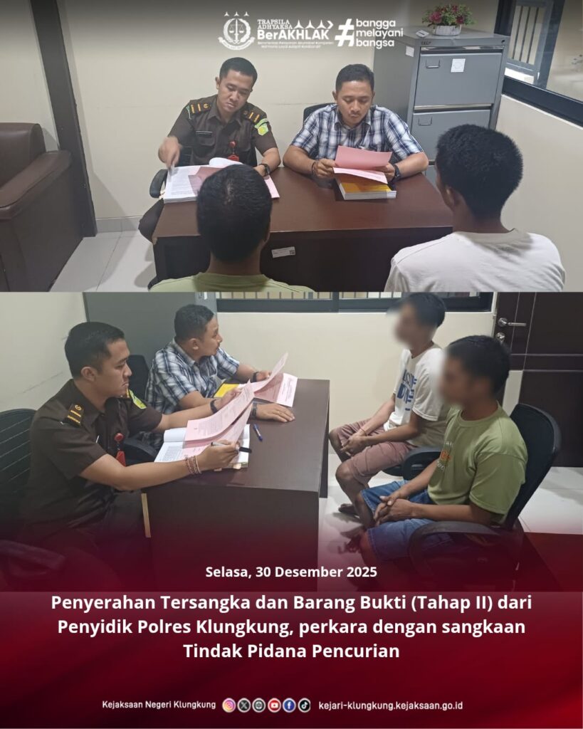 Pada hari Selasa tanggal 30 Desember 2025 sekira pukul 16.30 Wita bertempat di Ruang Tahap II Kantor Kejaksaan Negeri Klungkung, Jaksa Penuntut Umum Kejaksaan Negeri Klungkung I.D.G.P. Awatara, S.H., M.H. didampingi Petugas Pemulihan Aset dan Pengelolaan Barang Bukti telah menerima Penyerahan Tersangka dan Barang Bukti (Tahap II) dari Penyidik Polres Klungkung, perkara dengan sangkaan Tindak Pidana Pencurian