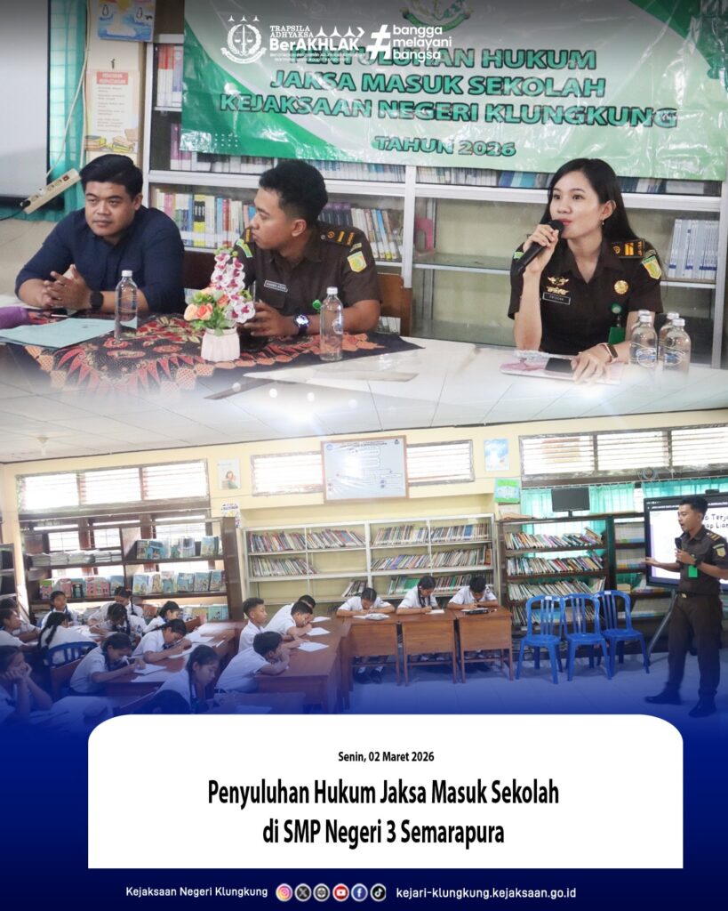 Senin, 02 Maret 2026, Kejaksaan Negeri Klungkung melaksanakan kegiatan Penyuluhan Hukum Jaksa Masuk Sekolah di SMP Negeri 3 Semarapura.