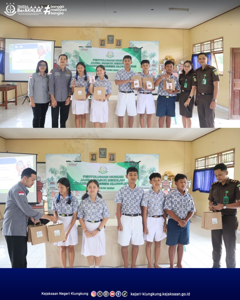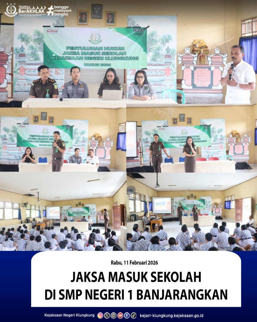 Kasubsi II Intelijen Kejaksaan Negeri Klungkung, Chiko Surya Siswanto, S.H., didampingi Calon Jaksa pada Kejaksaan Negeri Klungkung dan Staf Bidang Intelijen melaksanakan kegiatan Penyuluhan Hukum Jaksa Masuk Sekolah (JMS) di SMP Negeri 1 Banjarangkan pada Rabu, 11 Februari 2026.