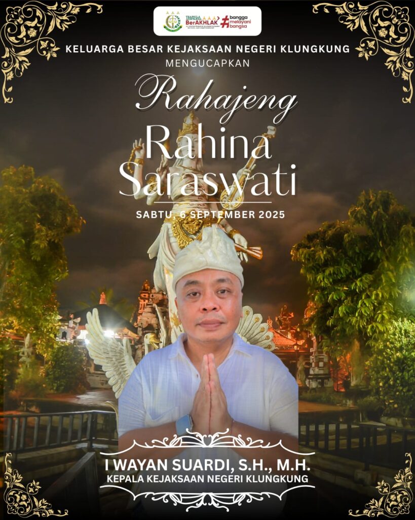 Rahajeng Rahina SaraswatiOleh admin kejari klk / 07/09/2025 Kepala Kejaksaan NegeriI Wayan Suardi, S.H., M.H berserta jajaran MengucapkanRahajeng Rahina SaraswatiSabtu, 06 September 2025 Salam ” MAHOTTAMA” Semarapura Jaya.